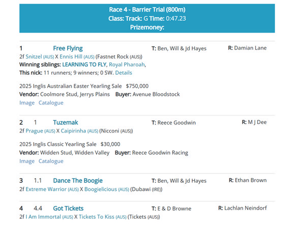 Three barrier trials at Caulfield on Thursday morning produced heat winners for first season sires Wild Ruler and Profiteer with the quickest winner being Free Flying, the half-sister by Snitzel to brilliant Group winning mare Learning to Fly.