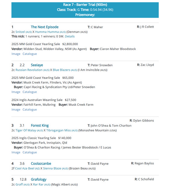 Trained by Ciaron Maher and ridden by Jason Collett, Snitzel colt The Next Episode is the equal highest priced yearling by his much missed late champion sire ever sold and showed the speed expected in his first public trial.