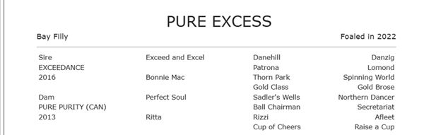 Pure Excess is the third foal, but first to race from Pure Purity, who found her way to Australia and was offered by Vinery (as agent) in foal to Exceedance at the 2022 Magic Millions Gold Coast National Broodmare Sale where she was snapped up by Belmont Bloodstock for $140,000.