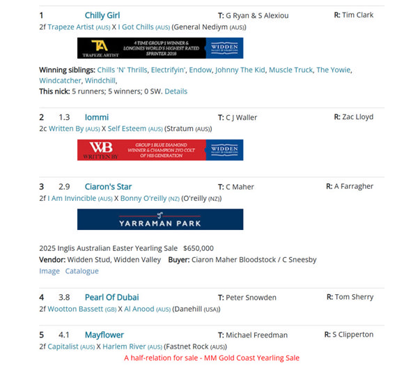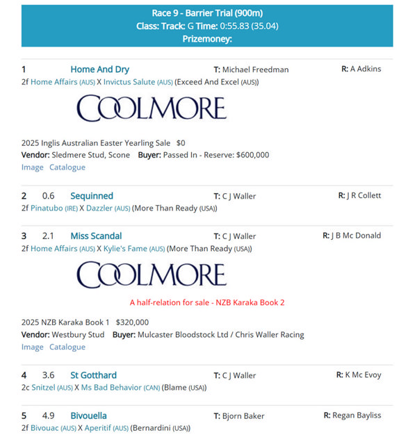 The other heat featured some interesting bluebloods with the Michael Freedman trained Home Affairs filly Home and Dry leading all the way to win ahead of a trio of Waller trained youngsters headed by Sequinned, the half-sister by Pinatubo (IRE) to Bivouac.