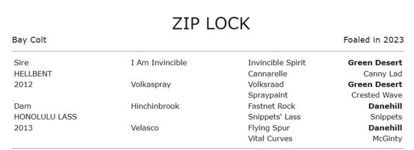 Zip Lock's damline (8-j) goes back to the mare Aulone. Her Gimcrack Stakes winning daughter Civic Pride (Ajax) was the dam of champions Amneris and Pride Of Egypt and founded a prolific and famous family which still thrives.