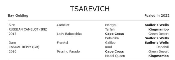 Not offered at auction, Tsarevich was bred by Jorshan Investments in partnership and is the first and only foal of Frankel mare Casual Reply (GB) (she died in 2024), a half-sister to Group III placed Scandalo from the family of dual Group I winning sprinter Regal Parade.