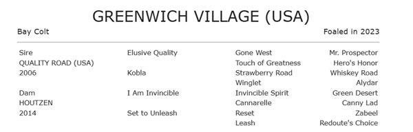 Greenwich Village was a $350,000 Keeneland September Yearling purchase for SF Bloodstock/Starlight Racing/Madaket Stables and is the second foal to race and second winner for Houtzen.